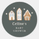 Whimsical Christmas theme baby shower favor sticker featuring illustration of gingerbread house with blue accent.