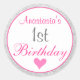 A rosa quente e bonito e a brilha prateada brilha a primeiro aniversario clássico de adesivo redondo. Você pode adicionar facilmente o nome de sua escolha e alterar a cor e a fonte usando a opção personalizar!