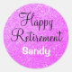 Adesivo clássico redondo com brilho personalizado, feliz aposentadoria, com fundo brilhante roxo e escrevendo preto e branco. Você pode adicionar facilmente o nome de sua escolha e alterar a cor e a fonte do nome usando a opção personalizar!