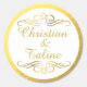 Um adesivo redondo elegante e elegante com folha de ouro falsa floresce sobre um fundo branco, esboçado com uma fronteira clássica do ouro. Clique no botão PERSONALIZAR TI para adicionar seu texto. Vem com 5 cores. A combinar os convites de casamento, guardar as datas, os cartões de mesa, os RSVPs, os guardanapos de cocktail, portas copos e muito mais disponíveis. Para perguntas ou pedidos relativos a outros itens com este design, contacte: cheryl@cheryldanielsart.com. "Swirly Flourish with Frame", por Cheryl Daniels © 2015.