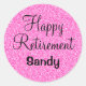 Adesivo clássico redondo com brilho personalizado, feliz aposentadoria, com um fundo brilho rosa quente e um escrevendo preto elegante. Você pode adicionar facilmente o nome de sua escolha e alterar a cor e a fonte do nome usando a opção personalizar!