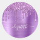 Autocolantes personalizados, elegantes e femininos, com brilho púrpura pingando um fundo metálico falso roxo. Personalize com seu nome em um bonito roteiro branco com pinceladas.