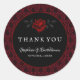The Gothic wedding Thank you sticker is designed to be elegant and mysterious.The Design features red and black damask and a red bleeding rose.. The font is in a delicate, almost white shade of gray that contrasts with the dark background.