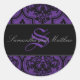 Impressão de damasco roxo e preto com efeito de gradação e etiqueta de casamento gótica monograma.