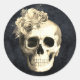 Um adesivo redondo clássico com um elegante design do crânio Gótico do Halloween. Ele apresenta um crânio floral branco sobre um fundo texturizado preto. O crânio é acentuado com lindas rosas brancas. Esses adesivos são versáteis e podem ser usados para selar envelopes, decorar favoritos para festas ou simplesmente adicionar um toque de gota a vários itens.