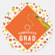 Favor de festa de congratulações de graduação criativa, adesivos de presente de graduado ou selos de envelope com o característico chapéu de graduação laranja com uma borla dourada em fundo de confete. Edite o texto para adicionar o nome do graduado e o ano da turma de formandos.