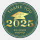Cor personalizada elegante, moderna e personalizada (mostrada em verde) obrigado de graduação que você adesiva para a CLASSE DE 2025. O design apresenta uma folha metálica falsa de ouro 2025 e boné de formatura ou placa-mãe na sua escolha de cor de fundo que você pode mudar para uma cor escolar ou uma cor personalizada. Utilize como favorito de parte adesivos ou selos de envelope. ASSISTÊNCIA: para obter ajuda com a modificação/personalização do design, alteração de cor, alteração de ano ou transferência do design para outro produto ou para coordenar itens, entre em contato com o designer ANTES DE PEDIR por meio do Zazzle Chat ou makeitaboutyoustore@gmail.com.