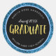 adesivo de graduação em na moda redondo com uma borda azul esfarrapada e a palavra "Formando" em folha de ouro falsa da moda. Personalize-o com seus detalhes substituindo o texto do marcador de posição. Para obter mais opções, como alterar a fonte, o tamanho/cor do texto, o espaçamento entre letras ou para contrair ou expandir o texto curvo, clique no botão "Personalizar". *Observe que a Marca d'água Zazzle que aparece na visualização de zoom NÃO aparecerá no produto impresso final © Rosewood e Citrus
