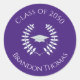 Esta design apresenta uma etiqueta de formando de formando de graduação, um elegante selo clássico moderno, um boné clássico de cartão-morteiro, folhas de laureado clássicas, uma classe personalizada de nomes, tema de cores da escola, tema roxo, etiqueta de convite de festa de formando de graduação, um adesivo de festa de formando, uma celebração de celebração de festa de formatura, para etiquetas de formando de graduação formando adesivos