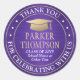 Adicione um toque elegante personalizado à graduação da faculdade ou do segundo grau, obrigado a cartões e favoritos para festas com adesivos roxos, brancos e dourados / selos de envelopes. Todo texto é simples de personalizar. Design apresenta um fundo metálico roxo e esfregado, boné de conselho de morteiro de folha falsa e tipografia moderna. Observe que o ouro é impresso a cor, não a folha metálica. O texto inclui o ano da aula, o nome da escola e uma linha opcional para o grau, as honras ou a citação de inspiração favorita. Para usar como etiquetas de endereço de volta redonda nos convites ou em notas de agradecimento, mude o texto curvo para um nome e endereço. Parabéns ao formando!