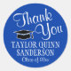 Adicione um toque elegante personalizado à graduação da faculdade ou do segundo grau, obrigado a cartões e favoritos para festas com adesivos reais, azuis e brancos redondos / selos de envelopes. Todo texto é simples de personalizar. Design apresenta um fundo azul, um boné de conselho de argamassa preta e uma tipografia do estilo de caligrafia moderna. Parabéns ao formando!