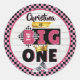 Urban Retro 90's Hip Hop primeiro aniversario Vibe! apresenta o texto "O Grande" em Painéis cor-de-rosa, pretos e brancos, com padrões de fundo de tijolos brancos e bicos correspondentes a tênis de bebê e coroa dourada. Cor rosa, preta, branca e dourada. Adicione o nome da criança. ©2022 Designs do Partido Sassy