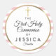 Bonito faixa rosa e branca Primeiro adesivo da Comunidade Santa com uma cruz dourada com uma elegante borda de folha de ouro que enquadra os detalhes especiais do evento de comemoração definidos na tipografia moderna. Projetado por Thisnotme©