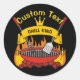 Churrasco sobre carvão inflamável, faixa de rolagem com texto personalizado sobre garfo e espátula. Cor de fundo personalizada. Texto superior personalizado.