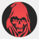 Esta imagem apresenta um crânio estilizado com capa encapuzada, reminiscente do Ceifador. O crânio é formado em uma cor vermelha e em negrito contra um fundo preto, criando um visual impressionante e sinistro. O capuz obscurece a maior parte da face do crânio, deixando visíveis apenas os olhos e parte da mandíbula. Os olhos estão estreitos e parecem olhar diretamente para o espectador, transmitindo um senso de ameaça e de prosseguimento. A atmosfera geral da imagem é de escuridão, mistério e uma pitada do macabro.