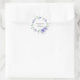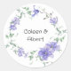 Adesivo redondo elegante com grinalda de clematite lilás e roxa e fonte manuscrita.