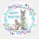 Dois coelhinhos estão no centro de uma alegre grinalda floral azul, rosa e roxa nesta adesiva da temporada de Páscoa. Ao lado das imagens dos coelhos há um texto em azul aqua que diz Feliz Páscoa! Perfeito para selar correspondências ou sacos de guloseimas de Páscoa.