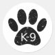 Um texto e impressão de pata de cão com estilo de desenho animado, com efeito de resmungão e ressonância aplicado à imagem. Autocolantes personalizados com tema K9. Ideia do presente.