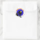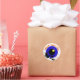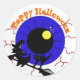 Olho humorístico com o reflexo da lua e das estrelas, e uma bruxa voadora com um gato preto assustador numa vassoura para o Halloween.