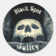 Caveira branca contra fundo preto ou escuro. O texto Black Spot acima do crânio. O texto Culpado sob a imagem. Um tipo de grande adesivo redondo personalizável. Você pode alterar a imagem e pode alterar ou excluir dois textos de modelo. Sinta-se livre para usar o botão Personalizar para ajustar o produto às suas necessidades, você pode alterar a cor da imagem alterando a opção Filtro, por exemplo. Piratas foram apresentados com um Black Spot para pronunciar oficialmente algum veredicto. Divirta-se e feliz Dia das Bruxas.