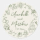 Personalized Hand-Drawn Quirky Wedding Stickers. These fun and playful round wedding stickers feature quirky doodle illustrations surrounding the edges in olive green against an ivory background, creating a soft retro look that feels perfect for an Italian or European-inspired celebration. Elements like a champagne tower, wedding cake, disco ball, hearts, wedding bells, rings, cameras, and more create a whimsical and celebratory vibe. The bride and groom’s names and wedding date are displayed in the center in a mix of handwritten script and simple fonts in matching olive green.