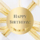A faux gold looking background. Black text: Happy Birthday! Decorated with faux gold leaves.