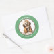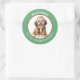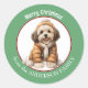 Uma imagem de um adorável filhote branco do que um filhote de cachorro Havanês vestindo seu casaco de inverno e que está no centro desse bonitinho adesivo de Férias. A imagem é emoldurada numa borda verde circular que contém o texto personalizado em branco. Perfeito para cartões de Natal, correspondência e pacotes de presentes.