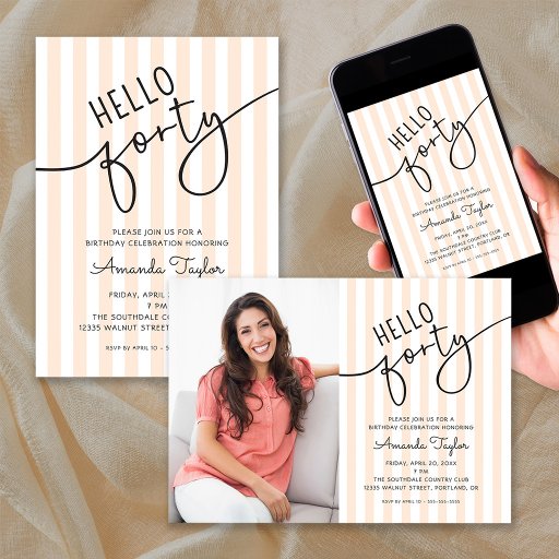 This 40th birthday party sticker showcases modern elegant script reading “Hello Forty,” complemented by a soft orange and white striped background. It's clean, refined design makes it a perfect addition to her celebration party.