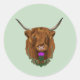 Um retrato de uma vaca escocesa, cabedal e cabeleira. Um palito escocês com nó celta verde está na frente da vaca.