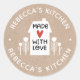 Um adesivo personalizado "feito com amor", com uma casinha fofa, de coração vermelho e as palavras, feito com amor em fundo de cor kraft. Personalize adicionando seu próprio nome. Um bonito toque final para todos os seus presentes caseiros. Projetado para você pelo Blackberry Boulevard.