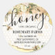 Os adesivos personalizados do pote de mel de vintage para colar em frascos de comida com bordas de cristal de agitação amarela e dourada, fundo de colmeia, gotas de mel, florais de aquarela branca, abelhas e seus detalhes apitivos.