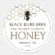 Pente de mel metálico esculpida com abelha estilizada e borda tracejada. Texto preto e marrom sobre fundo branco.
