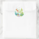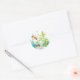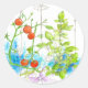 Vinhetas de jardim divertidas e coloridas que incluem um jardim vegetal com tomate de cereja, manjericão e uma louça a visitar desenhados em aquarela e tinta.