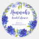 Adesivo de agradecimento para chá de noiva com hortênsias azuis lindas. Uma coroa floral de hortênsias azuis grandes, folhagens e flores silvestres azuis cerca o texto de graduação. O nome da noiva é escrito em uma fonte de letra cursiva muito popular e bonita. O sentimento de agradecimento é escrito em uma fonte serifada em letras minúsculas. Isso lhe dá um visual muito moderno. Todo o texto do modelo é fácil de editar. Você pode alterar a fonte e a cor. Você também pode mudar o fundo branco para qualquer cor.