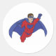 Ilustração de um super-herói vestido de fantasia vermelha e azul com capa voando pelo ar