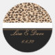 Um grande adesivo redondo de casamento mostrado numa impressão de leopardo preta e safari. Personalize este adesivo com os seus nomes e data. Imagem do stock freepik.com