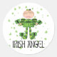Esta Rua do Dia de Patrick mostra uma garotinha vestida de verde com asas verdes e a legenda "Anjo Irlandês" em um fundo de camarões.