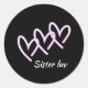 Uma irmã luv triplo coração fundo preto com texto rosa. Adicione esses adesivos para aniversários, baby showers, casamentos ou presentes de feriados. Edite o texto para alterar o nome ou a cor do fundo. Este adesivo é para o amor de irmã que você compartilha.