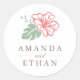 Os adesivos personalizados das ilhas são projetados para combinar com a nossa coleção de convites para o casamento de Island Hibiscus, com os nomes dos casais em letras elegantes e esticadas com uma ilustração floral de hibisco tropical em coral e verde.