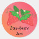 Etiquetas brilhantes para o seu "compota de morango" Dois morangos maduros com caules e folhas verdes.