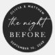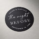 Adicione um toque elegante de finalização ao seu janto de ensaio de casamento com este adesivo preto redondo com a frase "A Noite Antes". Projetada em uma fonte serif de eterno com fundo preto em negrito, esta etiqueta de favor minimalista é perfeita para temas de casamento preto, moderno ou monocromático. Ideal para selar envelopes, favoritos para festas, bolsas de boas-vindas ou material de bebida no seu evento de pré-casamento.