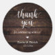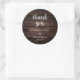 Modern Wedding Rustic Obrigado Presente O favorito clássico Round Sticker, em roteiro limpo, pequeno coração vermelho, com assinatura de noiva e noiva e data de casamento, tema de madeira marrom caseira.