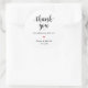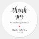 Moderno casamento Russo Obrigado Presente Clássico a favor Round Sticker, em roteiro limpo, pequeno coração vermelho bonito, com assinatura de noiva e noiva e data de casamento, tema preto e branco.