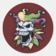 crânio de mau com grin grande de mau. Desenho original de caneta e tinta, com cores Mardi Gras digitais. T-shirts, suores, canecas, artigos de presente.