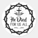 Jesus morreu por todos nós, este design cristão apresenta uma coroa de espinhos com texto dizendo "Ele morreu por todos nós" em preto e branco.