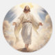 O adesivo redondo é mostrado com um impressão de arte de Jesus em sua glória. Vinheta pequena mostrada. Personalize este item ou comprar como está. Imagem licenciada