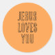 Você pode personalizar todo o texto deste adesivo "Jesus ama você" escrito em um guião preto moderno sobre um fundo laranja brilhante. Este simples adesivo bonito pode ser personalizado com um nome ou outras palavras-chave. Seria um presente excelente para truques, travessuras ou sanduíches. Podem ser adicionados como decoração ou como fecho a um saco ou cartão de tratamento. Pretende-se encorajar as crianças e os adultos a serem amados pelo seu Pai celestial com um amor eterno. Veja outros designs nesta coleção de expressões cristãs e de ditados religiosos.