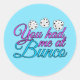 Você me teve em Bunco. Uma frase engraçada de cultura de pop para um jogo divertido. Apresenta uma imagem de dados rolando sobre um fundo azul bonito.