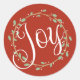 Uma simples coroa botânica com bagas e a palavra "Joy" em uma escrita em fundo vermelho. O selo perfeito para seus cartões de natal!