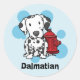 Os adesivos Dalmacianos bonitos para amantes de cachorros avistados! Um desenho kawaii da raça dos cães fica sentado por um hidrante vermelho de fogo. Perfeito para representar este famoso cão de bombeiro! Desenho adorável com fundo de manchas azuis. Disponível em uma grande variedade de mercadorias.